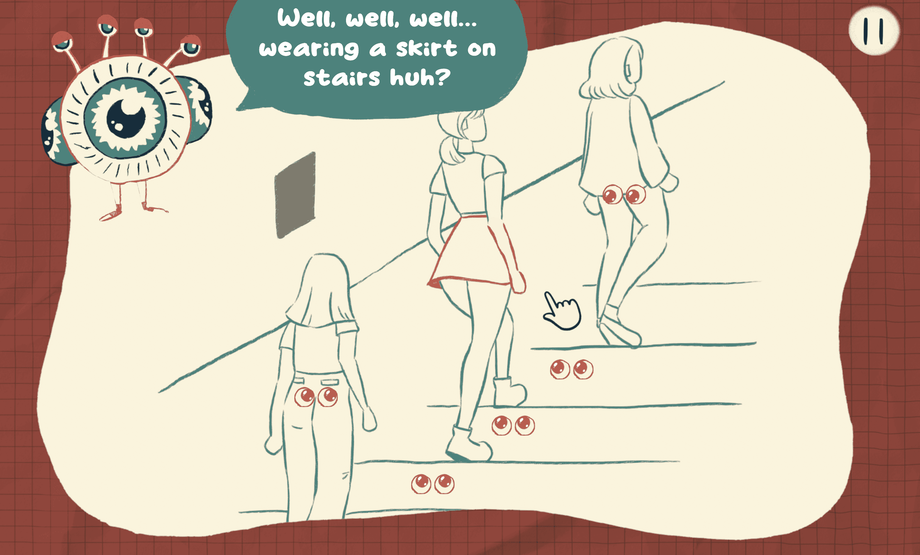 This interactive story game tackles victim-blaming culture surrounding gender issues. Through 9 compelling levels of everyday experiences, players are empowered to embrace vulnerability and reject judgment. The game fosters self-reflection, challenges absurd societal norms, and inspires action toward a safer, more inclusive world.