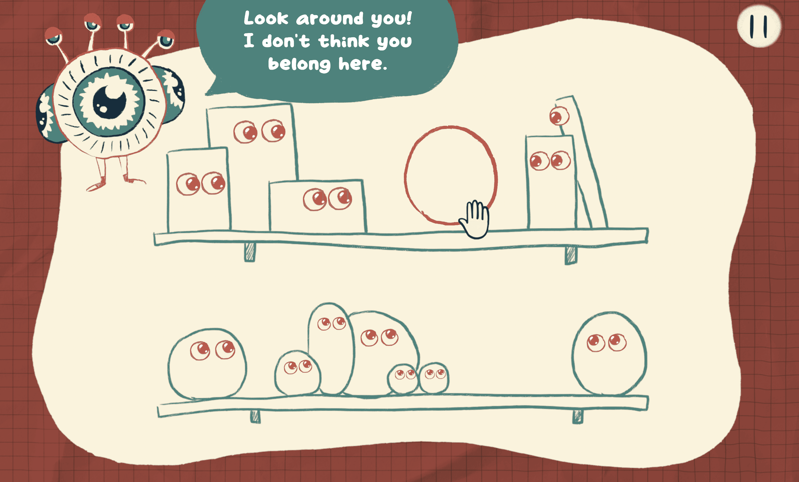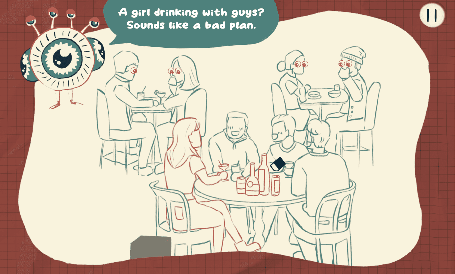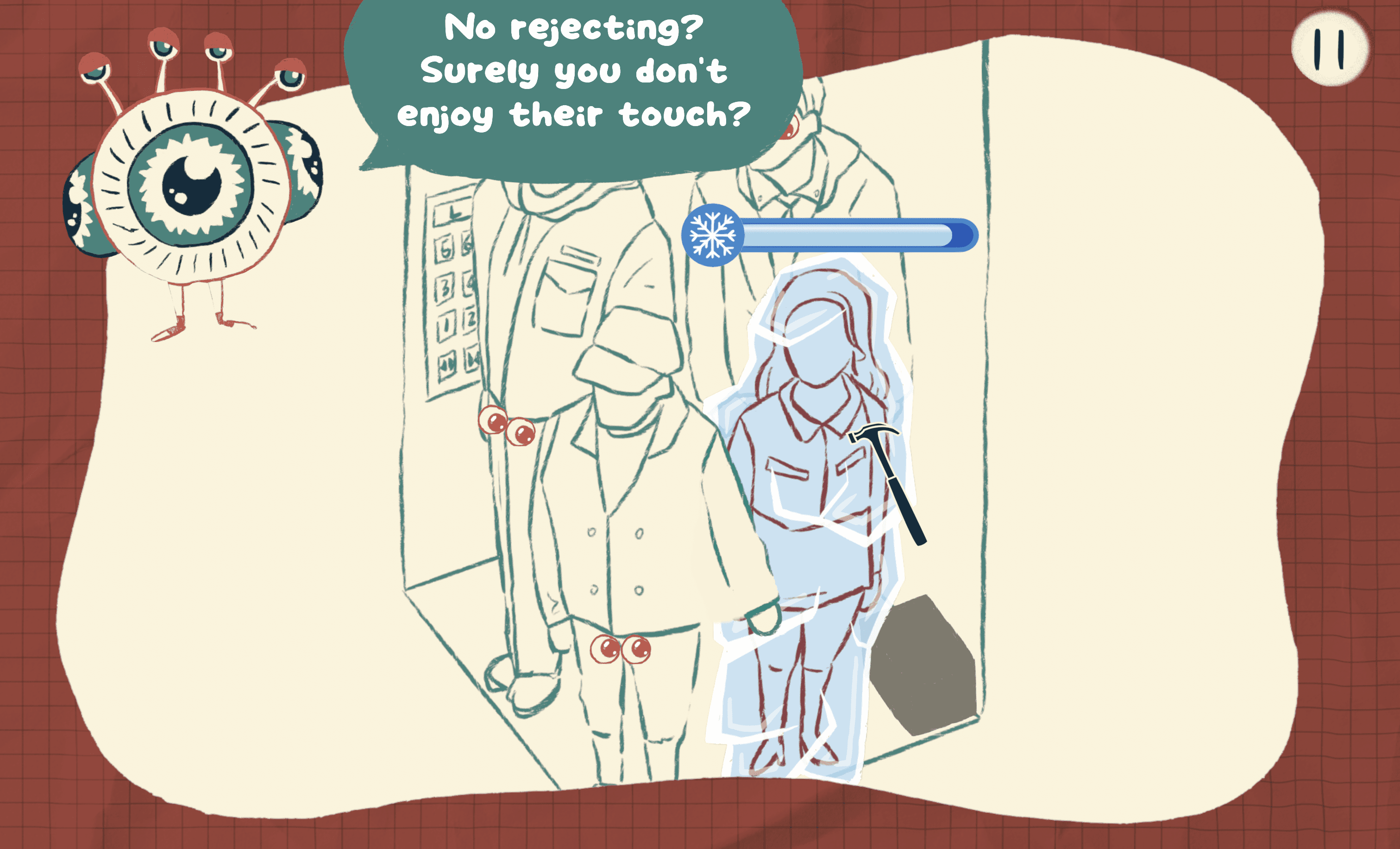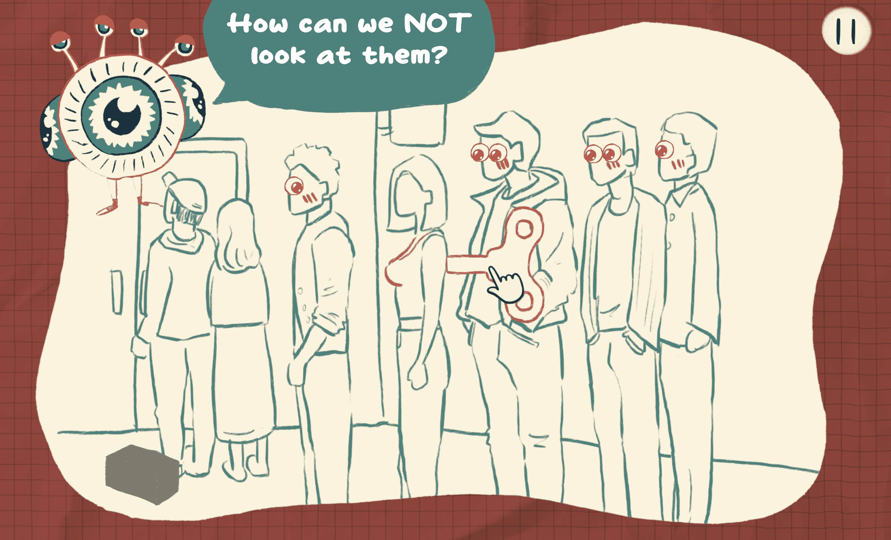 Players begin as red characters, out of alignment with social norms, and complete levels by adjusting interactions. Success is visualized as closing Peepers’ eyes and turning characters green, signaling progress and clarity in gameplay.